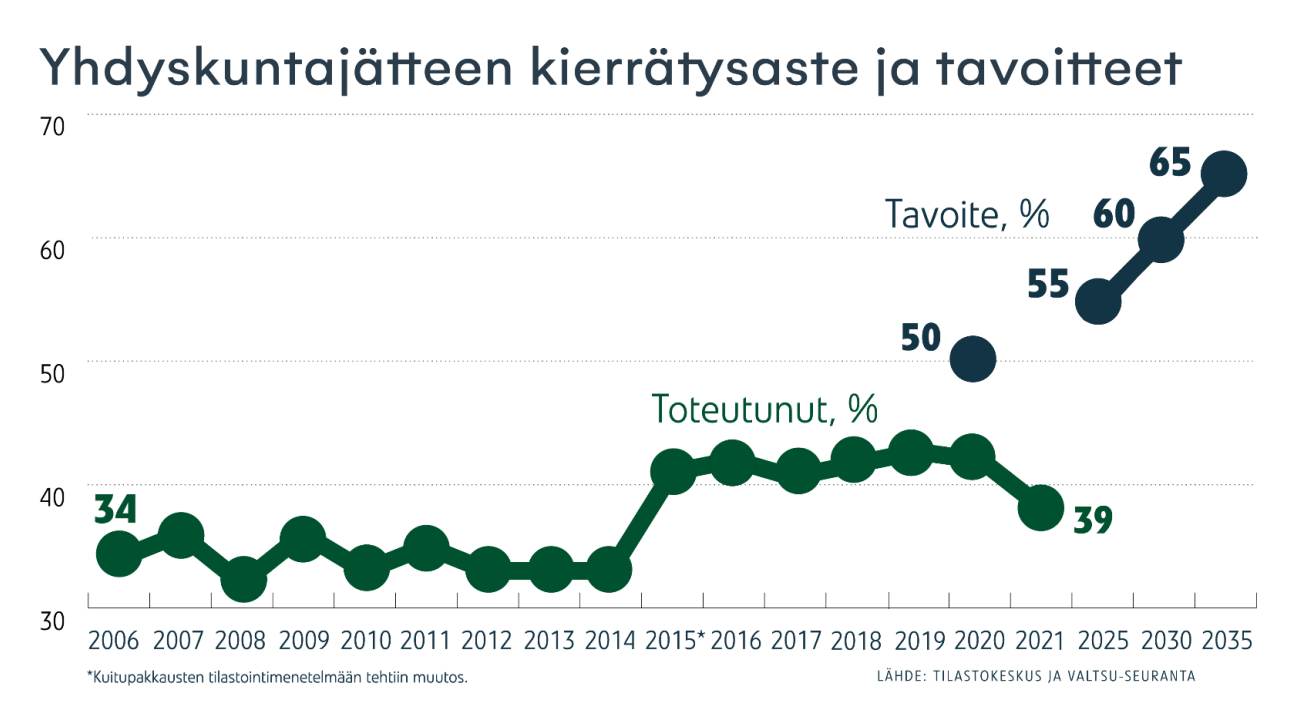 Suomessa liian suuri osa kierrätyskelpoisesta jätteestä päätyy poltettavaksi eikä kierrätysaste ole lähtenyt nousuun. Yhdyskuntajätteen kaatopaikkakäsittely on muuttunut radikaalisti, mutta jäte on siirtynyt kaatopaikoilta enimmäkseen polttoon.
