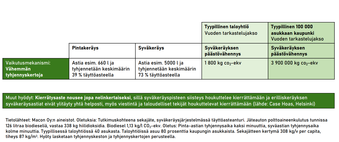 Syväkeräysastioille kertyy tyhjennyskertoja paljon vähemmän kuin pinta-astioille ja se vähentää huomattavasti liikenteen ympäristövaikutuksia.