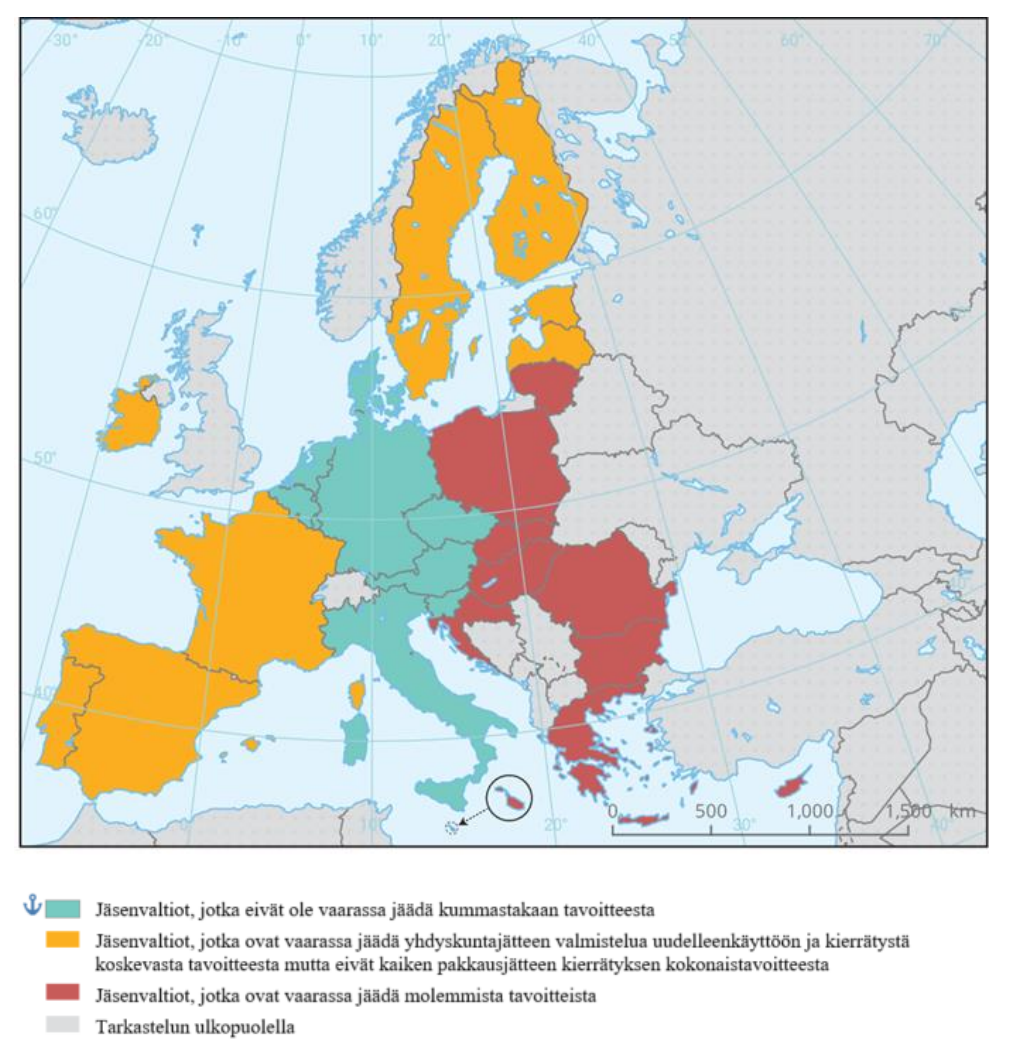 Kuva, Euroopan ympäristökeskus: Arvio EU-maiden suoriutumisesta yhdyskuntajätteen ja pakkausjätteen kierrätystavoitteiden suhteen.